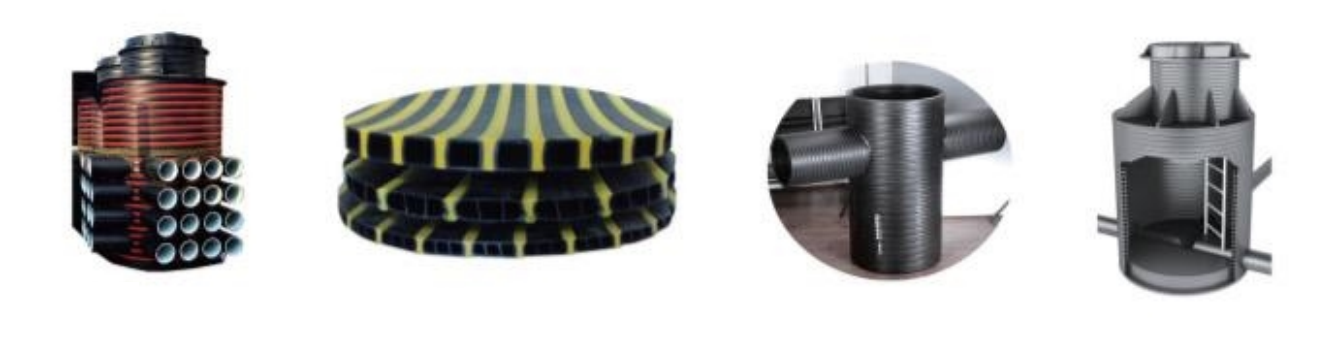 管道的应用:中空壁结构壁螺旋缠绕管质量轻、粗糙系数低,广泛用于埋地排水排污系统、雨水排放与收集、检查井、地方污水处理系统、涵洞管、化粪池、水罐、化工储罐、电缆护套管、模块室、和近海取水浮动管道等。